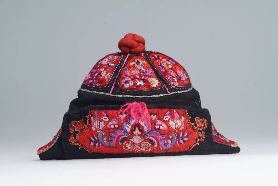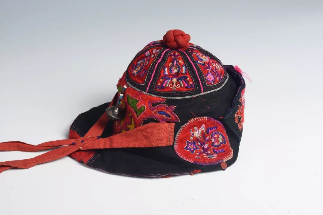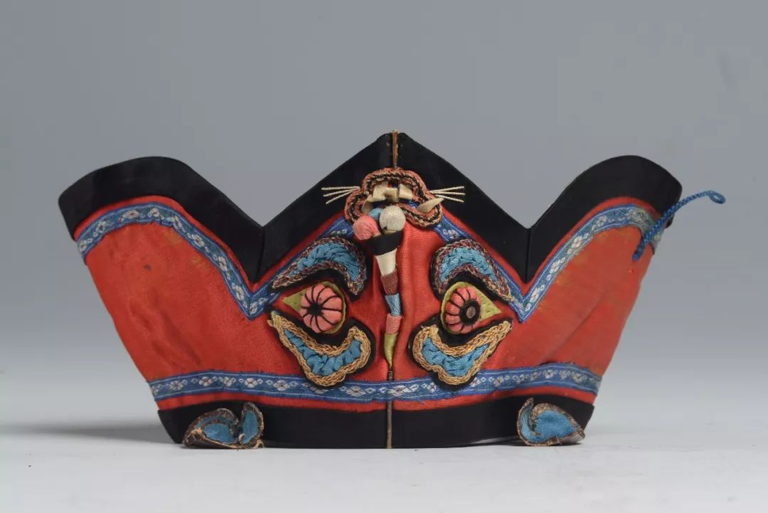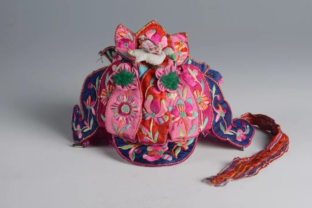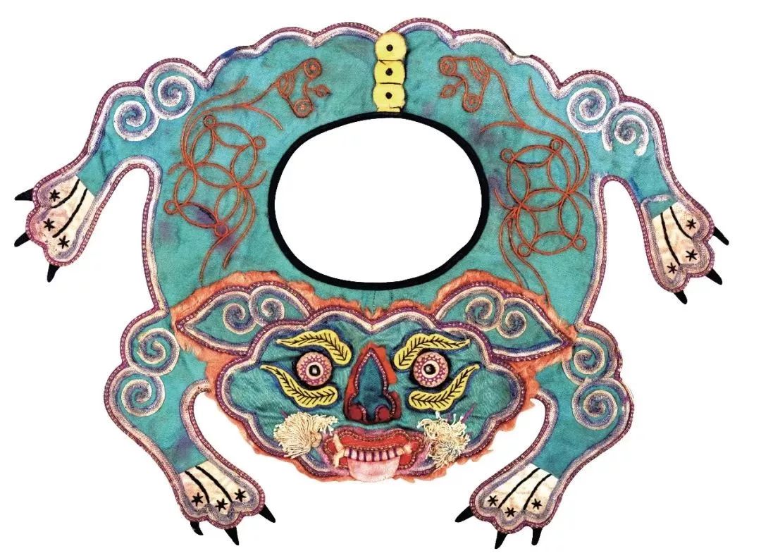 从清晚期至民国。儿童围涎留下了大量的实物,成为我国古代童装丰富内容的一部分。此次展览童装中还有虎头帽,虎头形象早在远古时期就以强悍英勇寓意而绵延发展,在民间,虎形的装饰在服饰中广泛涉及,种类繁多,在历经岁月的洗练后,造型与装饰图案丰富多彩,刺绣技法变化多端,色彩对比强烈,它蕴含的中国传统文化与民间习俗。