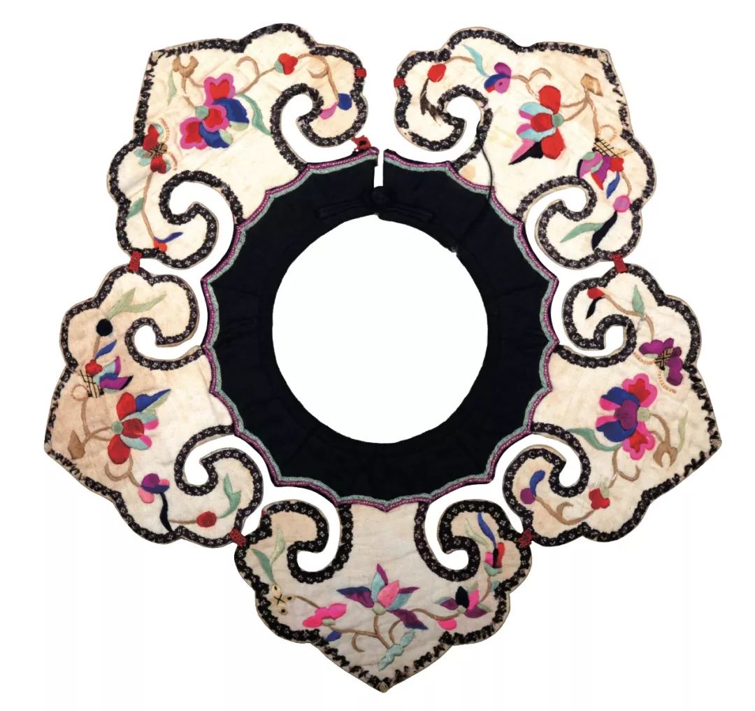 《民艺中国——女红系列展》于2018年7月20日——9月21日在中国美术学院民艺博物馆展览。本次展览,采撷古代文献、图片资料及今人诸多研究成果,与具体实物相结合,呈现中国人过去一百多年来日常生活方式中的穿戴。本次展览分为活色生香、颈上添花、绣中寻梦、锦堂焕彩、春晖苗绣五个部分。颈上添花部分主要展出的是民国时期围涎、童帽等。