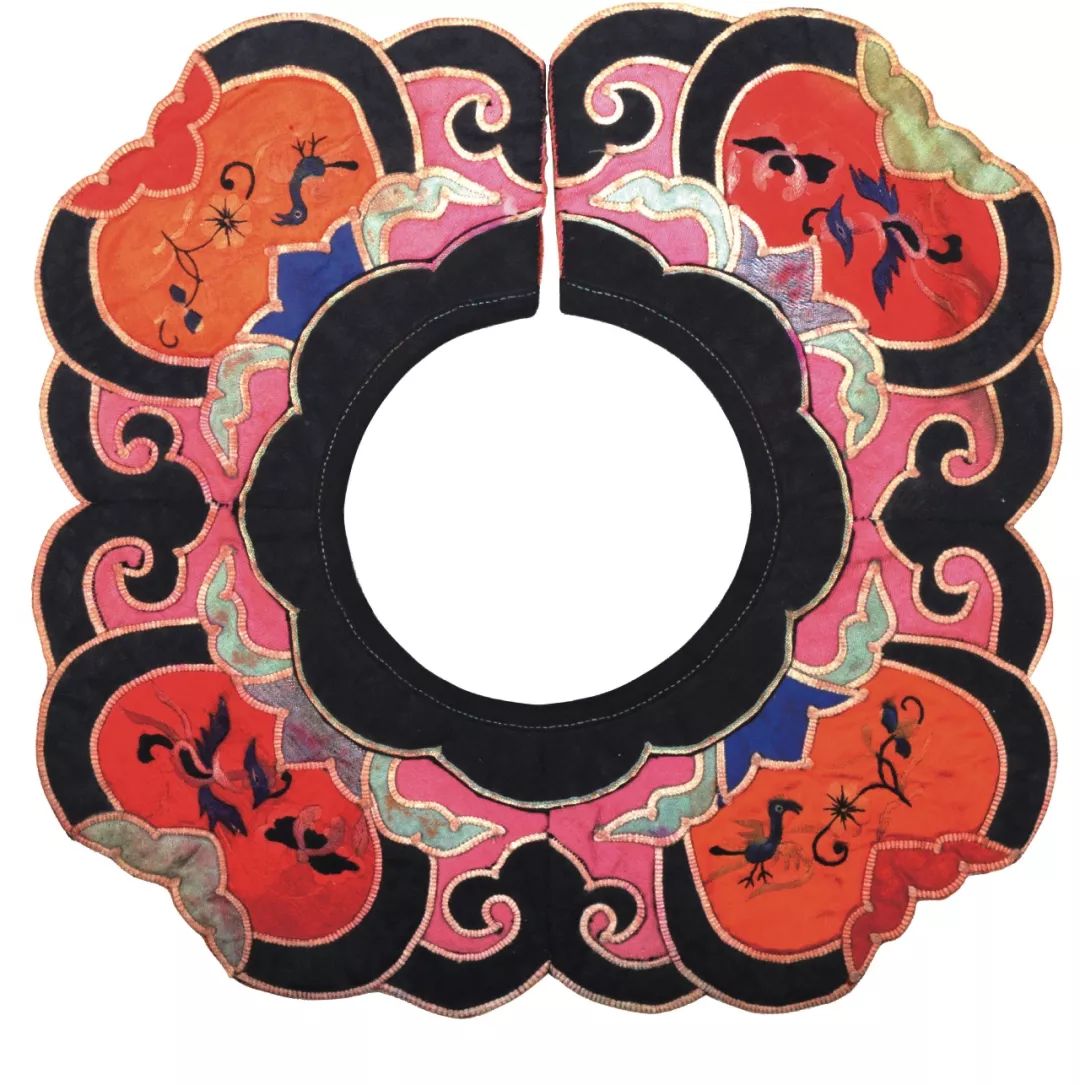 在传统服饰文化研究领域,很多学者将儿童围涎与女性云肩归为一类,被称为小云肩,是由于二者的外形,如形制、装饰手法等有许多相似之处。《元史·舆服志》记载:“云肩,制如四垂云,青缘,黄罗五色,嵌金为之。”云肩,明代亦称之为围肩,如崇祯《松江府志》记载:“女子衫袖如男子,衣领缘用绣帕,如莲叶之半覆于肩,曰围肩,间坠以金珠。”从上述文献记载可知云肩近似于后世的围涎。然而,儿童围涎更突出功能性,而女性云肩更多是体现装饰性。