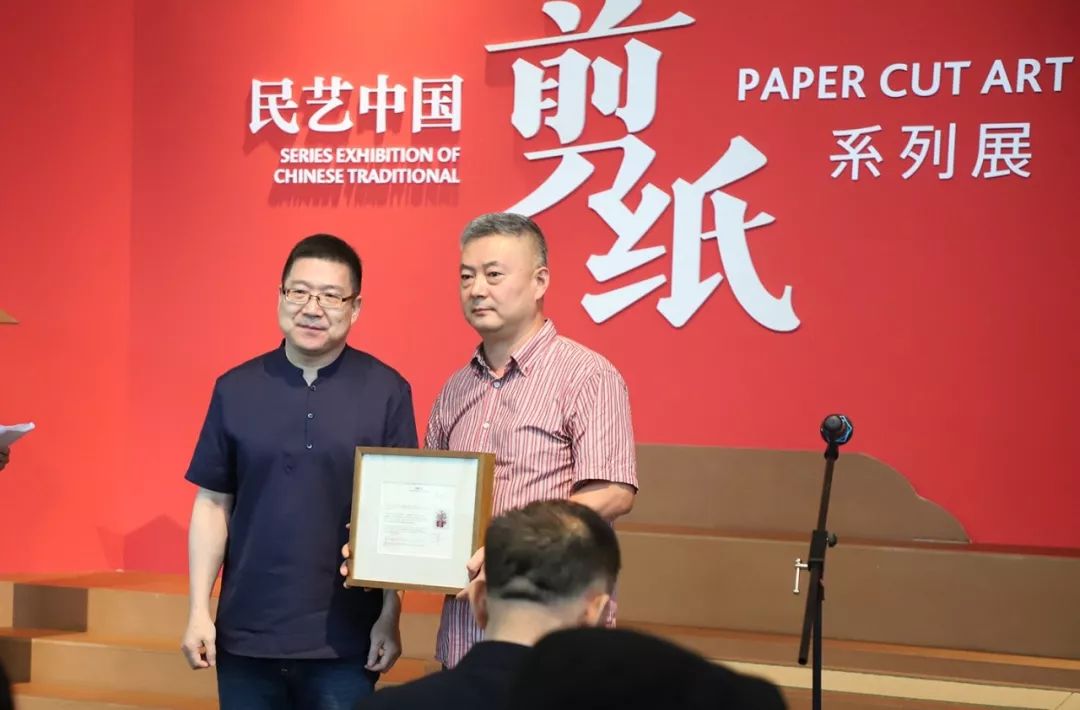 2019年6月21日上午10点,“民艺中国·剪纸系列展”在中国美术学院民艺博物馆开幕,展期至8月18日。开幕式由中国美术学院民艺博物馆研究部负责人任晓炜老师主持。开幕式上,中国美术学院民艺博物馆执行馆长、本次展览策展人吴光荣教授致辞,中华文化促进会剪纸艺术专业委员会副秘书长、参展艺术家代表、本次展览空间剪纸创作的作者栾旭初先生,中华文化促进会王石主席,中华文化促进会剪纸艺术专业委员会秘书长、捐赠艺术家代表周爱军女士分别发言。中国美术学院副院长兼美术博物馆总馆长杭间教授为捐赠人代表张树贤先生、丛树峰先生颁发捐赠证书。