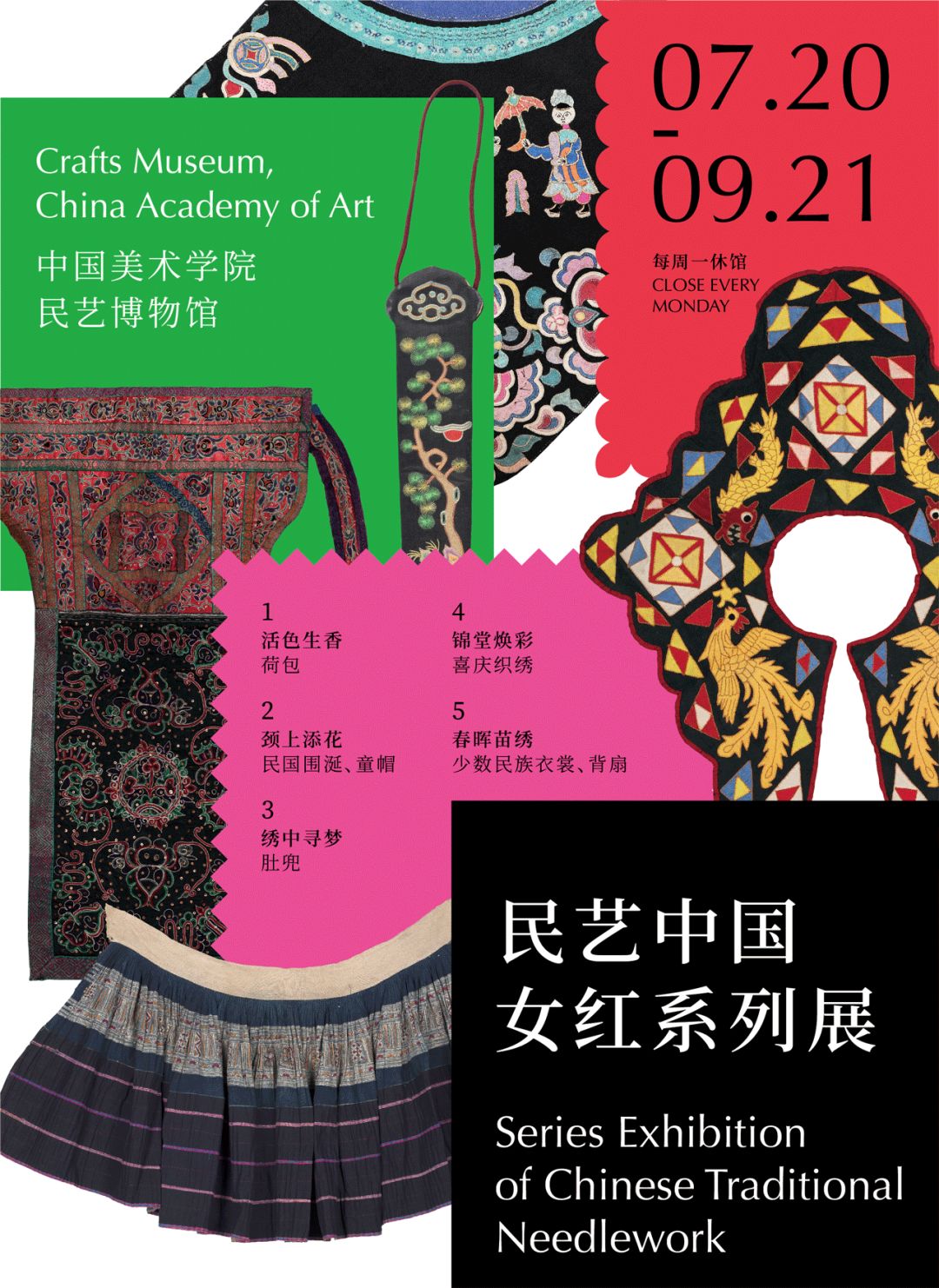 《民艺中国——女红系列展》于2018年7月20日——9月21日在中国美术学院民艺博物馆展览。本次展览,采撷古代文献、图片资料及今人诸多研究成果,与具体实物相结合,呈现中国人过去一百多年来日常生活方式中的穿戴。本次展览分为活色生香、颈上添花、绣中寻梦、锦堂焕彩、春晖苗绣五个部分。绣中寻梦部分展出品多为清末民初来自浙江台州以及部分山西地区的肚兜。