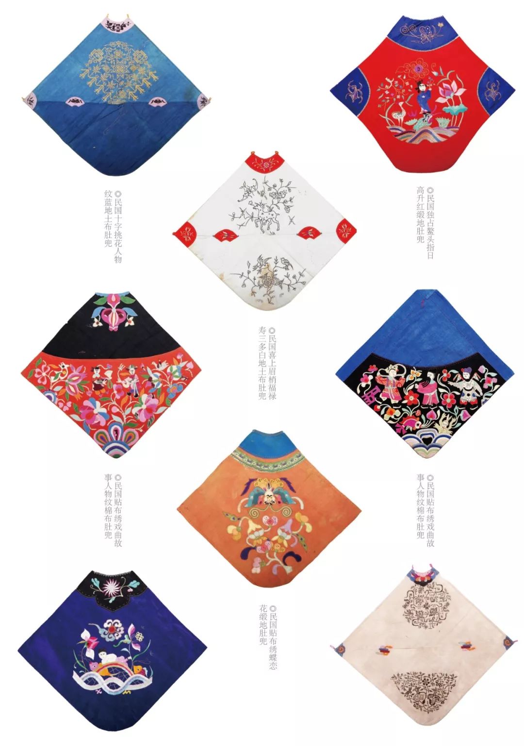 清代为肚兜最流行,男女老少皆有。肚兜上端成凹形的浅半圆状,上端的两角和左右两角附有带子,带子的材质有布绳、丝绳和金链等,最常见的穿着方法是上端两角系带子挂在脖上,下端尖角或圆角,各自系带在腰间,后背系结。除护胸腹部,让胃肠免受风寒。还具有乳罩和裹肚的作用。其美学具有东方设计的平面化、意象化、情感化的法则定律,延绵层叠,装饰性强。“民艺中国——女工系列展”的肚兜多为清末民初,来自浙江台州,以及部分山西地区。