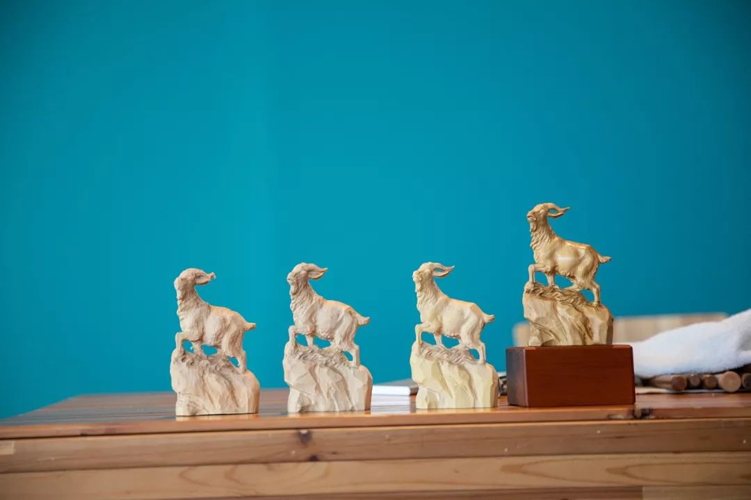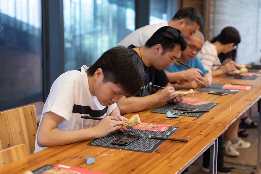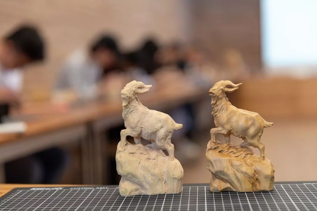 当天下午进行了民艺工坊《福雕黄杨.黄杨木雕制作之体验》手工体验课程。在课程开始,老师以PPT的形式,介绍了黄杨木雕的相关背景知识,讲解制作步骤及木雕工具的种类。接着老师向大家介绍不同刀具的使用方法。制作木雕的刀具主要分三种:平刀、圆刀、三角刀。其中平刀用来雕刻大的形体块面,圆刀用来刻画凹凸起伏处,三角刀则用来雕刻装饰线纹。本次课程中主要雕刻的主题为“弥勒佛”和“动物小羊”。