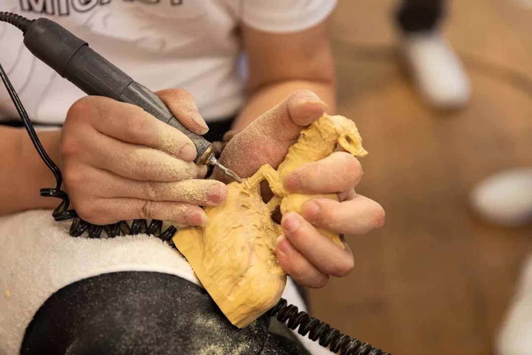 在看过老师示范后,大家对照着模型开始动手雕刻。自己上手,就发现障碍重重,每一刀都不容易下手。老师为每位同学耐心的改正握刀姿势,并提醒大家雕刻时可以借助肩膀的力量发力,以增强下刀时的力度。同时,雕刻时需要采取战术,先修平、后深入。用平刀按切块面的方式,将形体大转折表现出来;在此基础上,用圆刀刻画出凹凸起伏的褶皱、弧度;最后用磨砂纸打磨光滑。在雕刻过程中有时下刀的方向与木材生长方向相逆,这时强行雕刻会出现刻破的情况,需要调转手中的黄杨木,顺势而刻。经由一道道工序,原本普普通通的一段黄杨木,像是褪去了层层外衣,显现出清晰生动的精美造型。本期课程,通过现场传统工艺技法的示范,为广大民众提供了一次有意义的学习体验机会,让民艺走向公众、走近人们的生活。