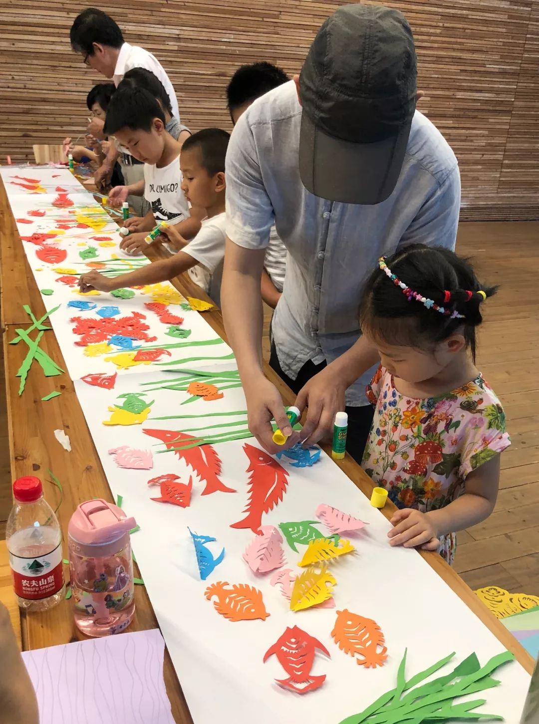 在老师耐心的讲解剪纸的技巧和方法后,小朋友们都迫不及待地动手制作主题为《年年有鱼》的剪纸作品。在出色的完成老师的任务后,小朋友们还意犹未尽的额外剪出了各式各样的鱼类和海洋动植物,与老师、家长一起携手创作了一份长卷作品。