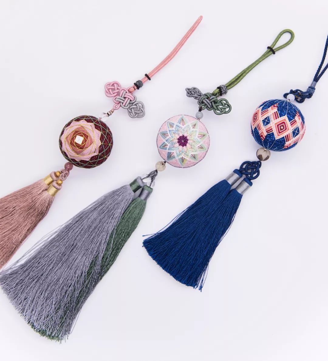 【材 料】材料包:鞠球球心、各色蕾丝线、金线、亮片、珠子、流苏、针
