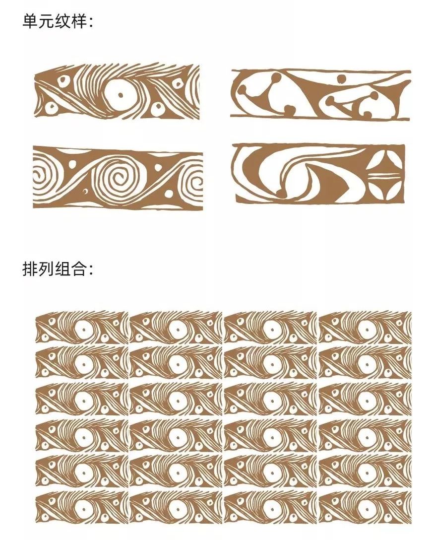 纹样是装饰花纹的总称,也叫纹饰或图案,具有装饰的属性,有着符号的象征意义与审美价值。人们通过实用器物的纹样应用,使审美理想在生活中得到体现。原始彩陶是中国新石器时代的代表性器物,蕴涵着丰富的人文色彩。原始彩陶纹样是原始先民们智慧的结晶,影响着我国装饰纹样的应用和发展。原始彩陶纹样的组织形式有:单独纹样、适合纹样、连续纹样(二方连续、四方连续);类型有:旋涡纹、网格纹,花瓣纹、菱格纹、鱼纹等;题材有:动物、人物、神兽、天象及各式几何纹等。原始彩陶纹样有着抽象的特点、鲜明的节奏感与韵律美,给我们以单纯、简练的印象,展现着远古人类朴素的艺术观念和原始的审美情感。