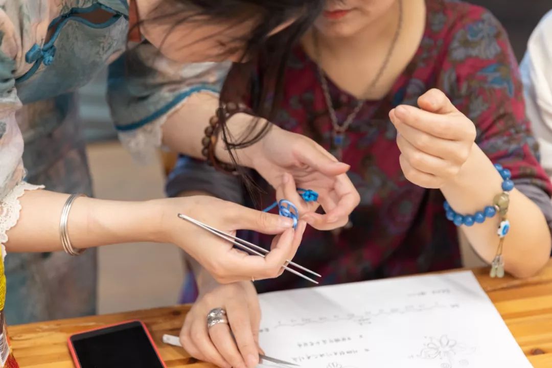 本期课程约30余位女红爱好者参与了课程,其中还有一位男士学员,但做起女红来也毫不逊色。盘扣是旗袍的重要元素,在旗袍中起到画龙点睛的作用,始于上古先民的结绳记事,后来女子按照自己的心性编结成扣,精心系于衣裳,喻意为同心结。粒粒盘扣,犹如开在女子心中的花,灼灼其华,藏有一份古典的美。