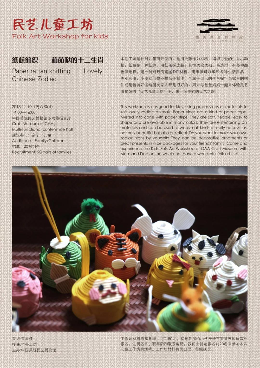 民艺儿童工坊是中国美院民艺博物馆的公教项目,主要面向儿童开设,目的是为儿童提供有意义的、持续的民艺生活体验,让小朋友们懂得观察生活、增强动手能力和对外部事物的认知。同时父母与孩子一同参加,可以增进相互之间的情感交流,让家长和孩子在工坊的体验中发现民艺的乐趣,丰富他们的周末生活。民艺儿童工坊将持续推出系列体验课程,请有意者关注并报名,我们按报名时间顺序进行选择。谢谢支持!