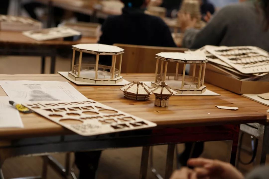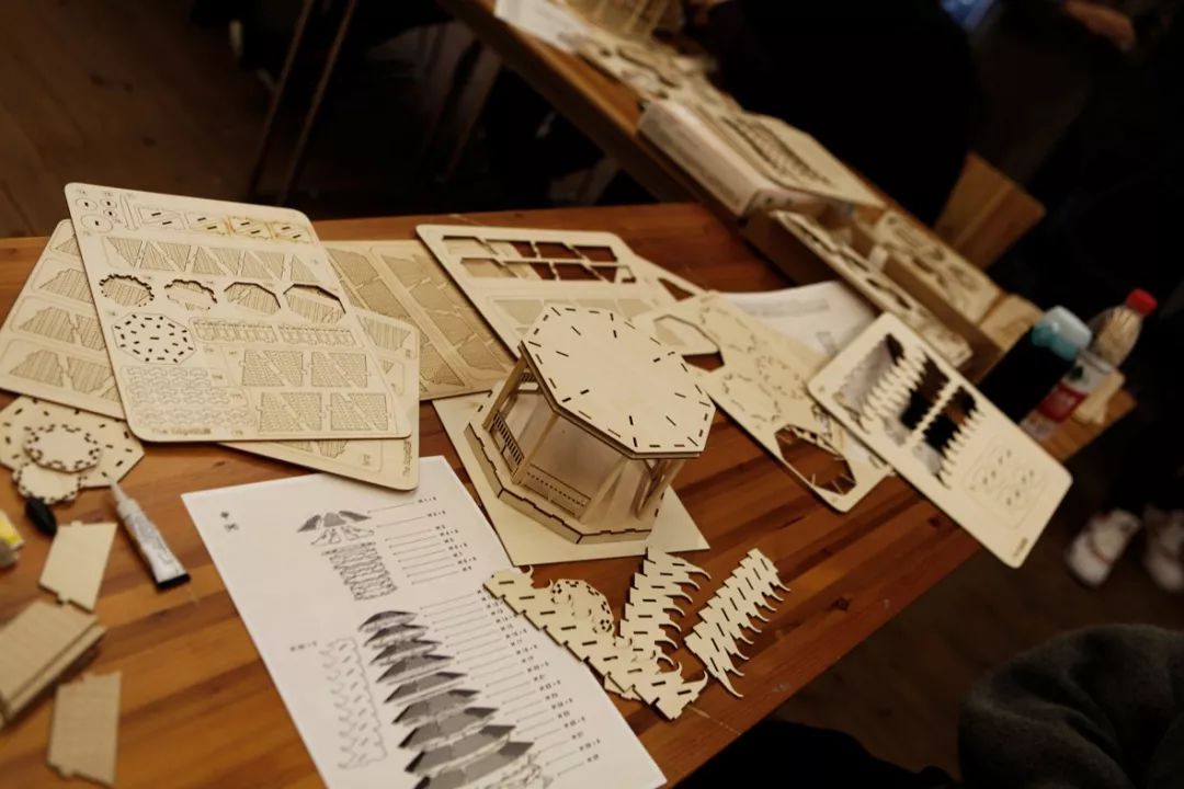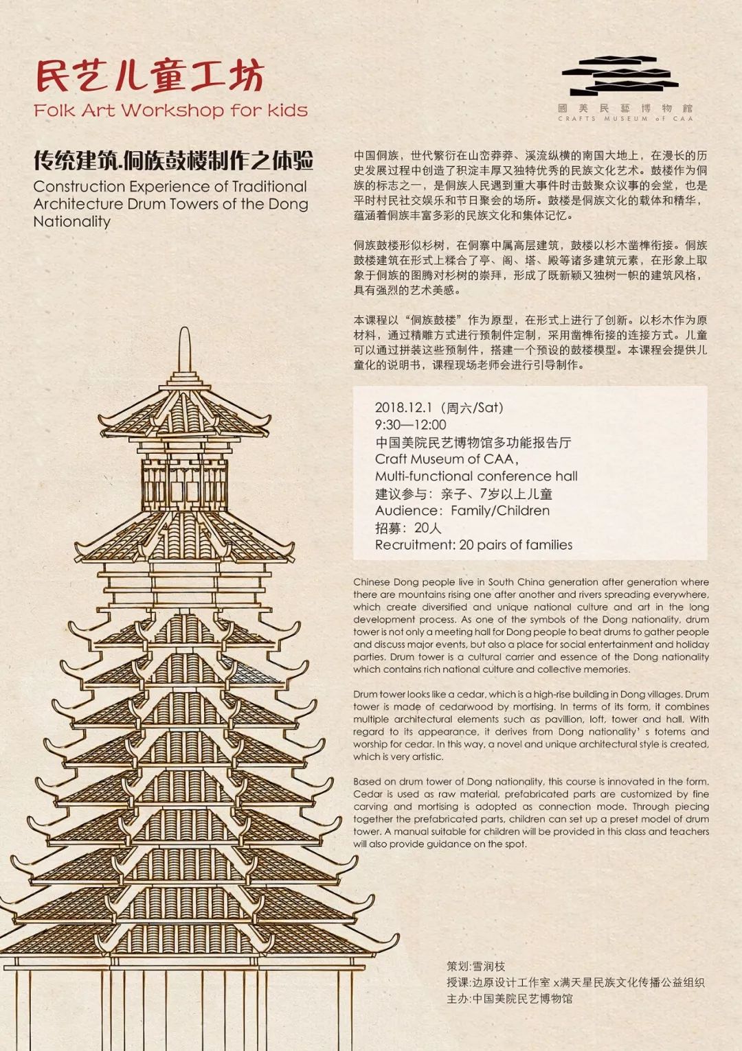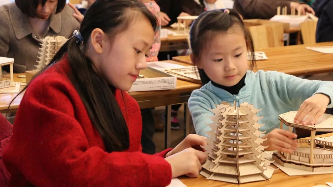 12月1日,在民艺博物馆的多功能报告厅,第二期民艺儿童工坊“传统建筑.侗族鼓楼制作之体验”课程圆满结束。本课程以“侗族鼓楼”作为原型,在形式上进行了创新。以杉木作为原材料,通过精雕方式进行预制件定制,采用凿榫衔接的连接方式。孩子们 通过拼装这些预制件,搭建一个预设的鼓楼模型。难度稍大的鼓楼建筑拼搭在家长和小朋友们的通力合作下,有了很棒的完成品。