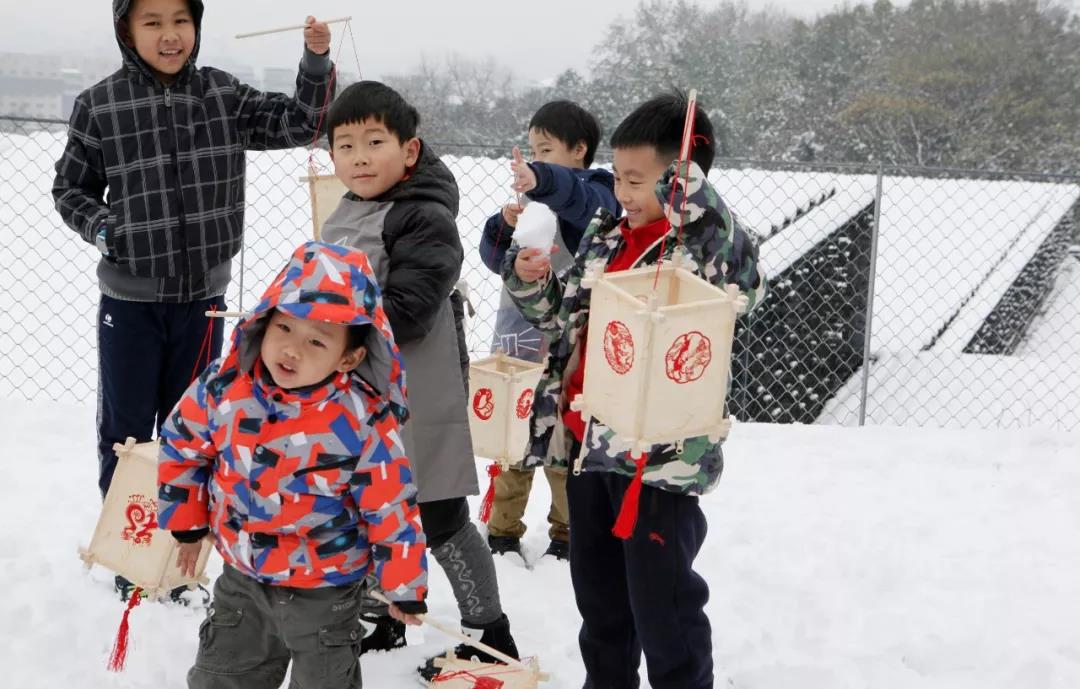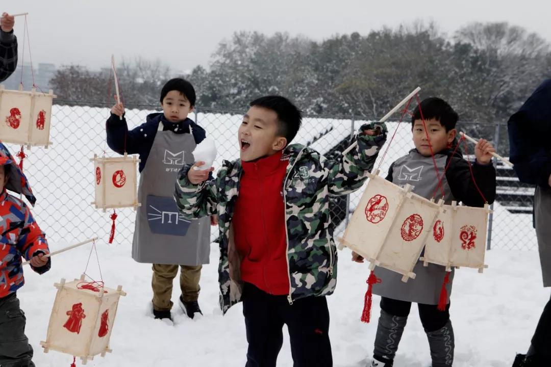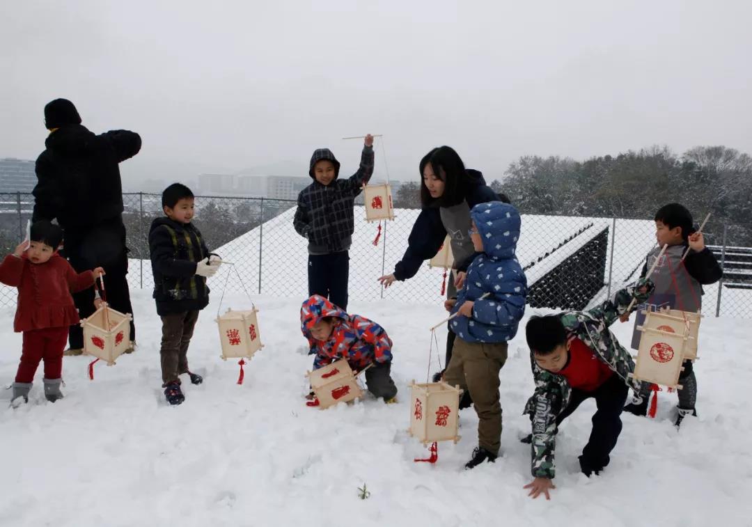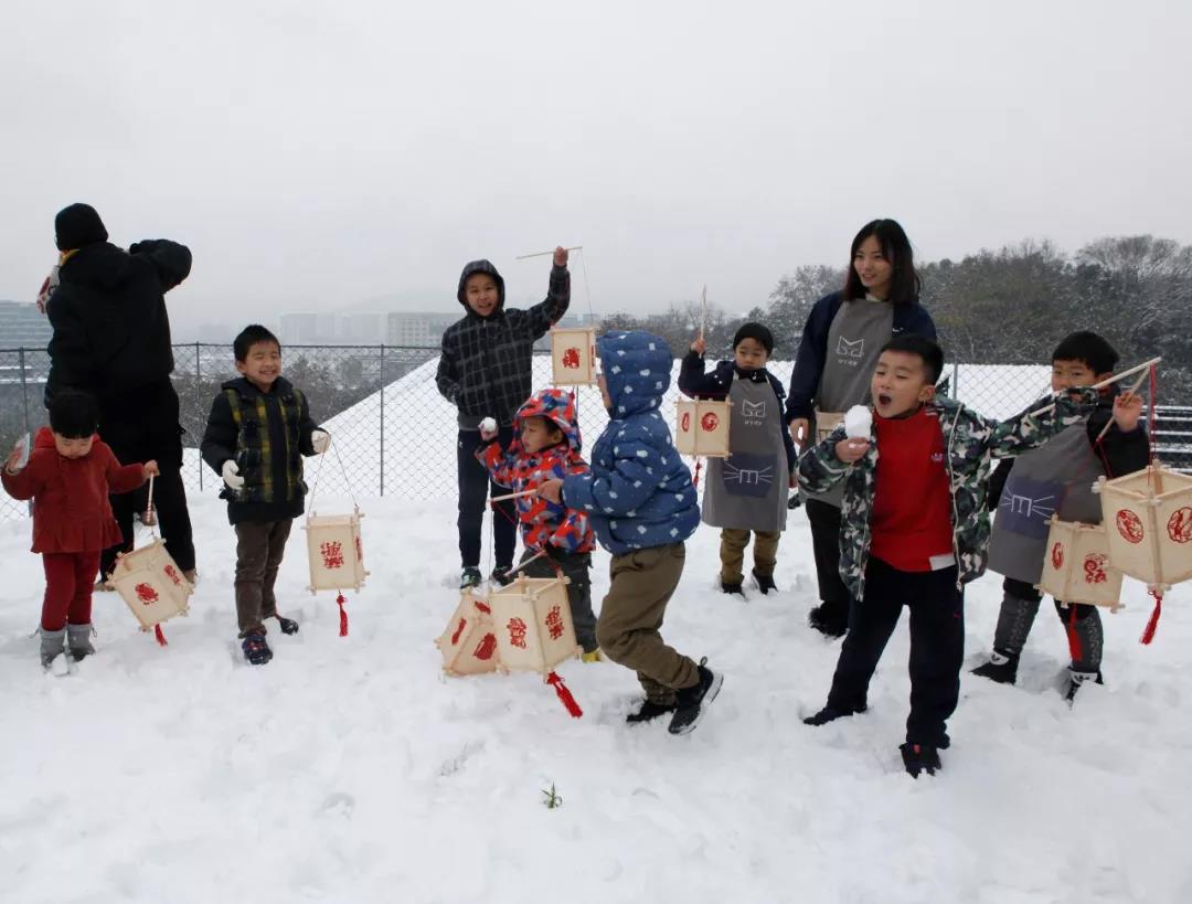 在活动的最后,孩子们手提着和家长一起精心制作的鲁班锁灯笼,在厚厚白雪覆盖着的民艺博物馆大屋顶平台上合影留念。小朋友们走在满是白雪的平台上,迫不及待的从雪地上抓起一把把白雪,在开心的玩耍中本次工坊活动圆满结束。
