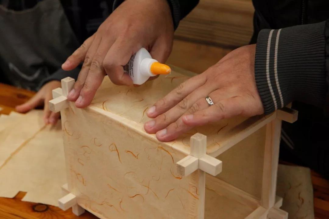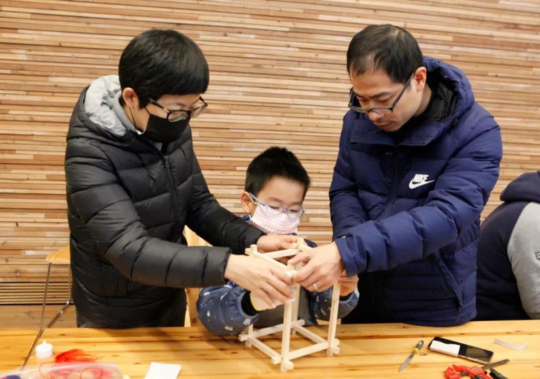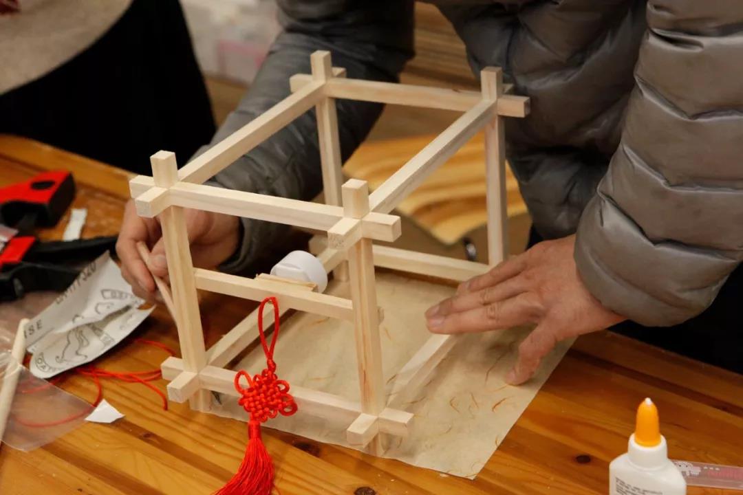 授课老师在活动开始前为小朋友们介绍了有关鲁班锁的知识、鲁班锁灯笼制作的流程及注意事项,小朋友们积极的参与老师的互动,氛围十分活跃。在制作的过程中,小朋友和家长互相配合,将一根根木条打磨成合适的形状,再进行榫卯结构的拼装。然后在灯笼表面糊上一层薄纸,装扮上中国结及寓意吉祥的剪纸,这样一件充满心意的手提鲁班锁灯笼就完成啦。