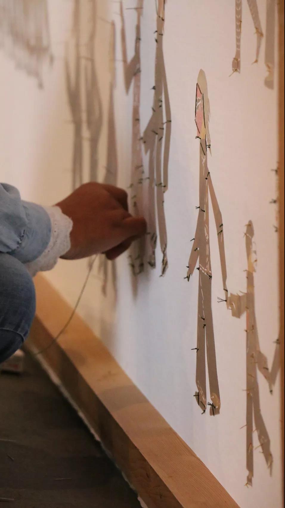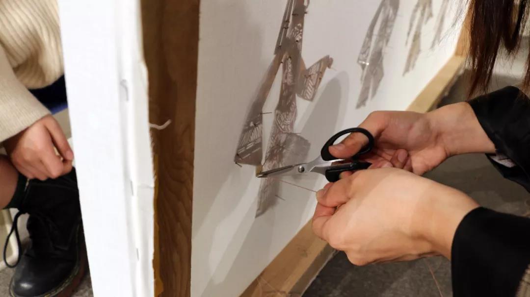 很高兴这次能够参与到皮影展的布展工作,成为志愿者的一员。我之前对皮影艺术并不是很了解,直到这此的布展工作让我能够更近距离地接触它。我们分配到的工作是皮影的固定,顾名思义就是将皮影固定到布上,只不过需要用针线来一针针地将它们缝上,其实我对针线并不陌生,但在实际操作上还是觉得有些困难的。我和另外一个志愿者一组,两人分别在皮影幕布的一前一后,穿针引线、寻找合适的固定点、打结等等都需要我们配合着完成。起初并不是很熟练,但看到固定完成的一整张皮影作品时,我的心中非常有成就感,不仅仅是因为完成了这项任务,更因为我们的工作能让参观的游客们看到更多美丽的作品!