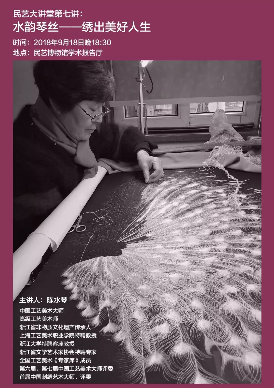 9月18日晚,由中国美院民艺博物馆主办的“民艺大讲坛”系列讲座第七讲:陈水琴《水韵琴丝——绣出美好人生》在中国美院民艺博物馆学术报告厅举行。陈水琴老师2006年被授予“中国工艺美术大师”荣誉称号。高级工艺美术师,浙江省非物质文化遗产传承人,上海工艺美术职业学院特聘教授、浙江大学特聘客座教授,浙江省文学艺术家协会特聘专家。全国工艺美术《专家库》成员、第六届、第七届中国工艺美术大师评委、首届中国刺绣艺术大师、评委。