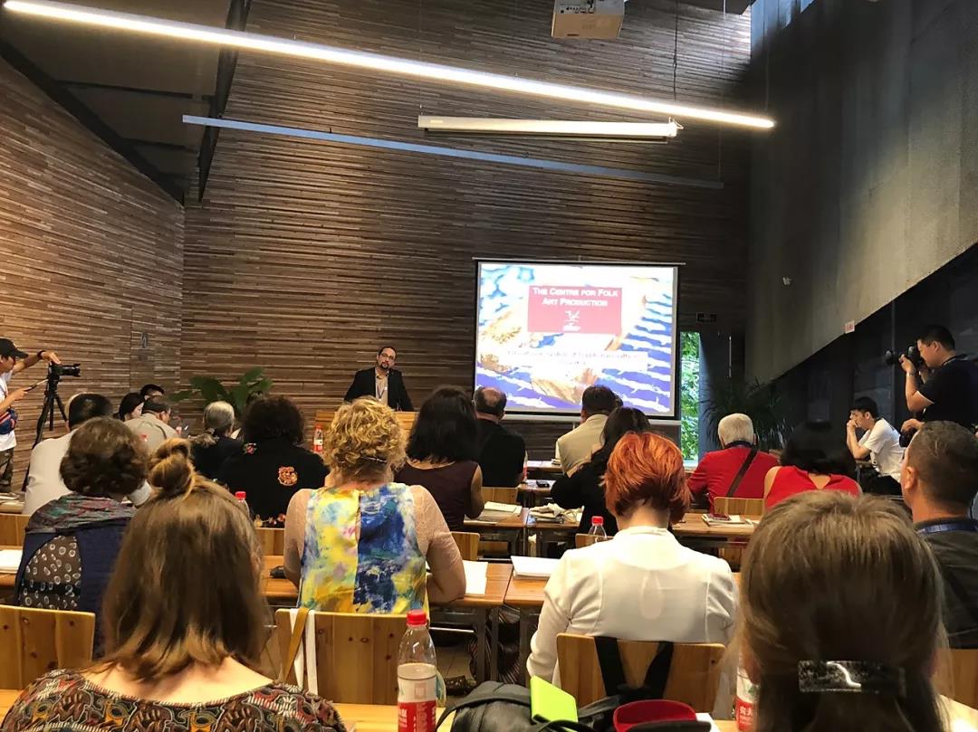 9月21日上午,由中华人民共和国文化和旅游部外联局、浙江省文化厅主办的“「大匠至心·手创造的文化记忆」第二届中国——中东欧国家非物质文化遗产保护专家级论坛”的专家代表来到分会场之一的中国美院民艺博物馆。专家代表们参观了《民艺中国——女红系列展》,并在民艺博物馆的多功能报告厅进行议题研讨。
