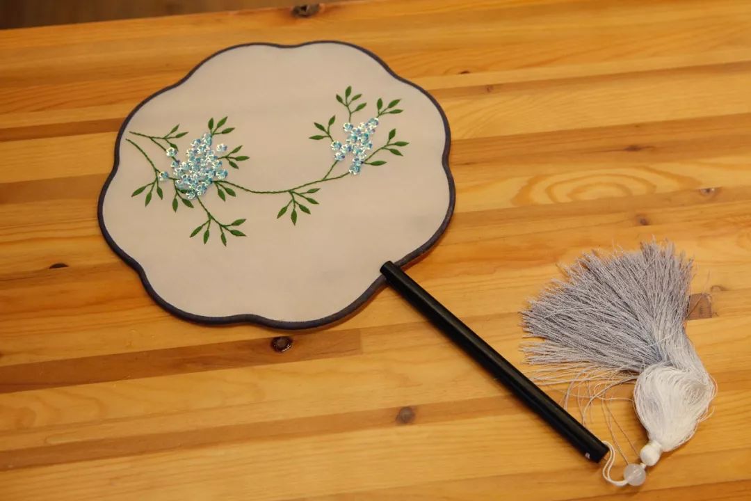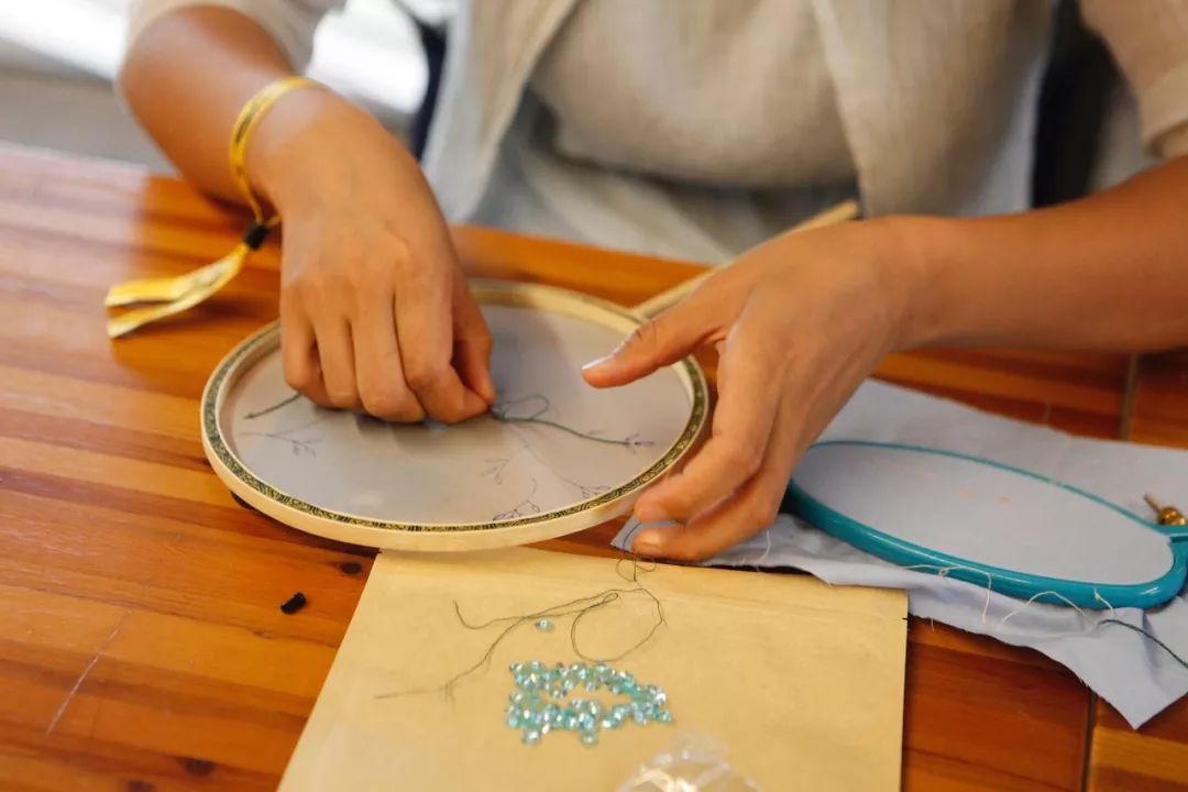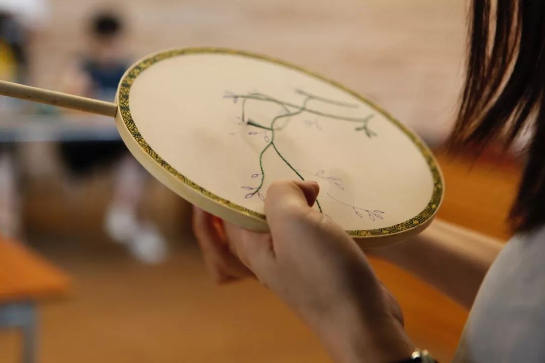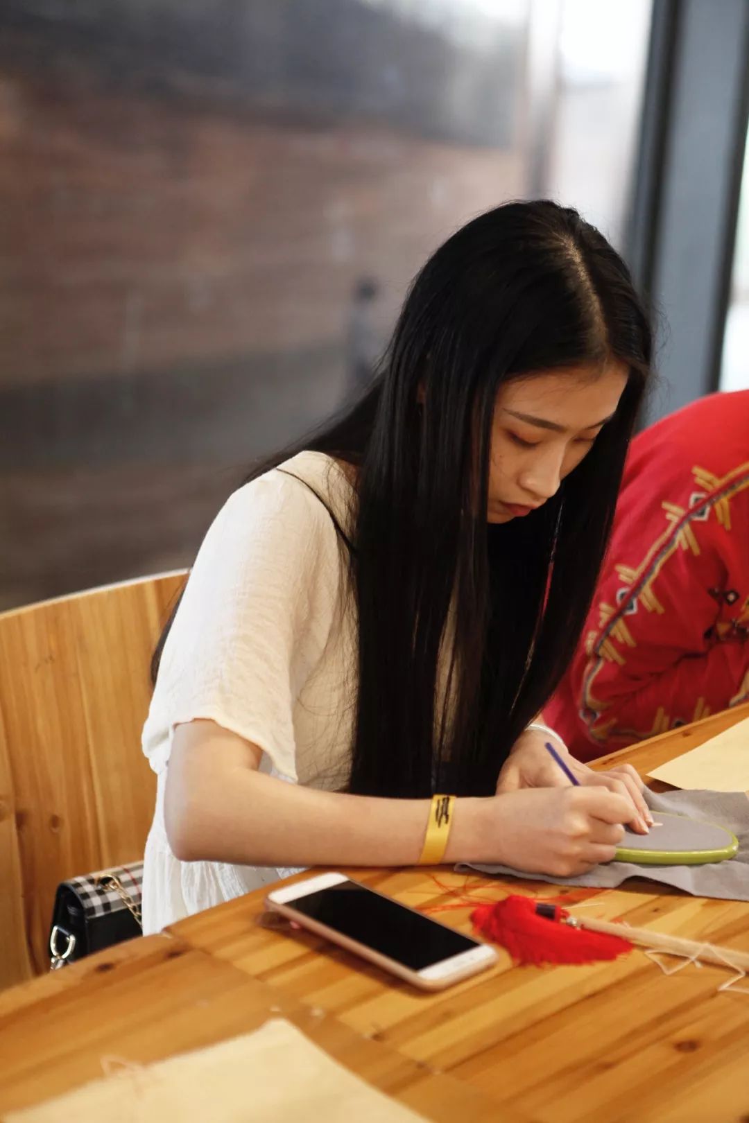 本次工坊我们特别邀请了[浅素]女红工作室的缪素青老师与她的助手来传授工艺技法。课程分为两个部分,第一部分:课程老师通过PPT讲解的方式讲解了中国女红艺术的起源与发展、女红的种类与艺术特征、珠绣工艺的制作流程、刺绣的前期准备及扇面的制作步骤。第二部分:在老师们的指导下完成手工课程作品“珠绣扇面”。学员们很投入的参与了本次课程,这是一场从手到心的民艺体验,领学员亲手操作,感受中国传统女红手艺的魅力。